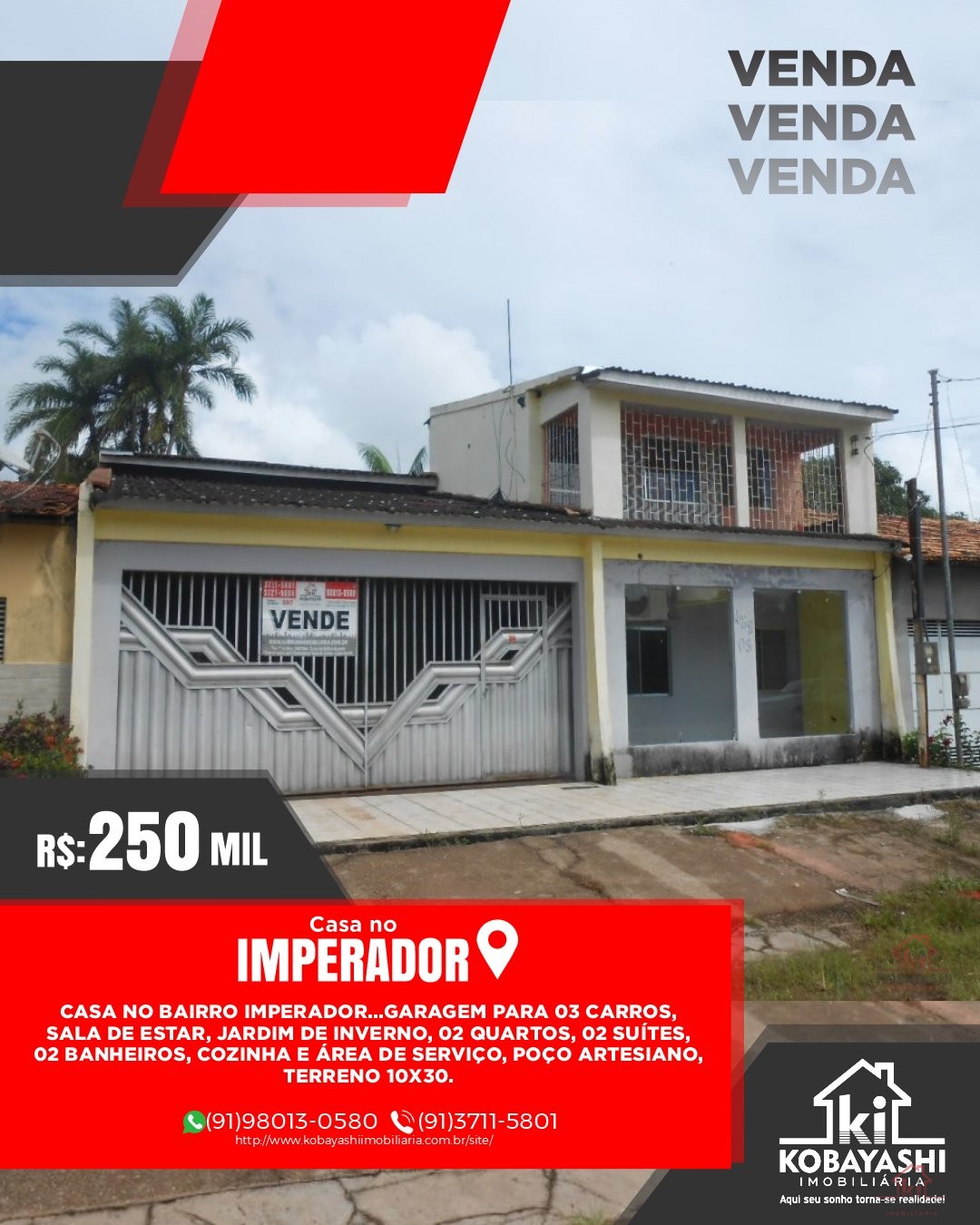 CASA NO BAIRRO IMPERADOR...GARAGEM PARA 03 CARROS, SALA DE ESTAR, JARDIM DE INVERNO, 02 QUARTOS, 02 SUÍTES, 02 BANHEIROS, COZINHA E ÁREA DE SERVIÇO, POÇO ARTESIANO, TERRENO 10X30.