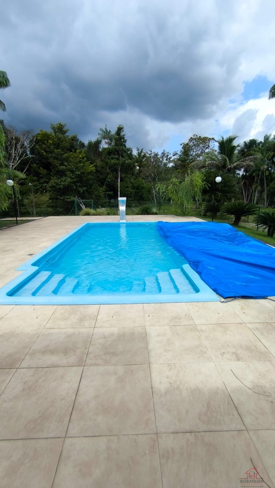Aérea gourmet com churrasqueira, banheiro social, piscina com cascata.